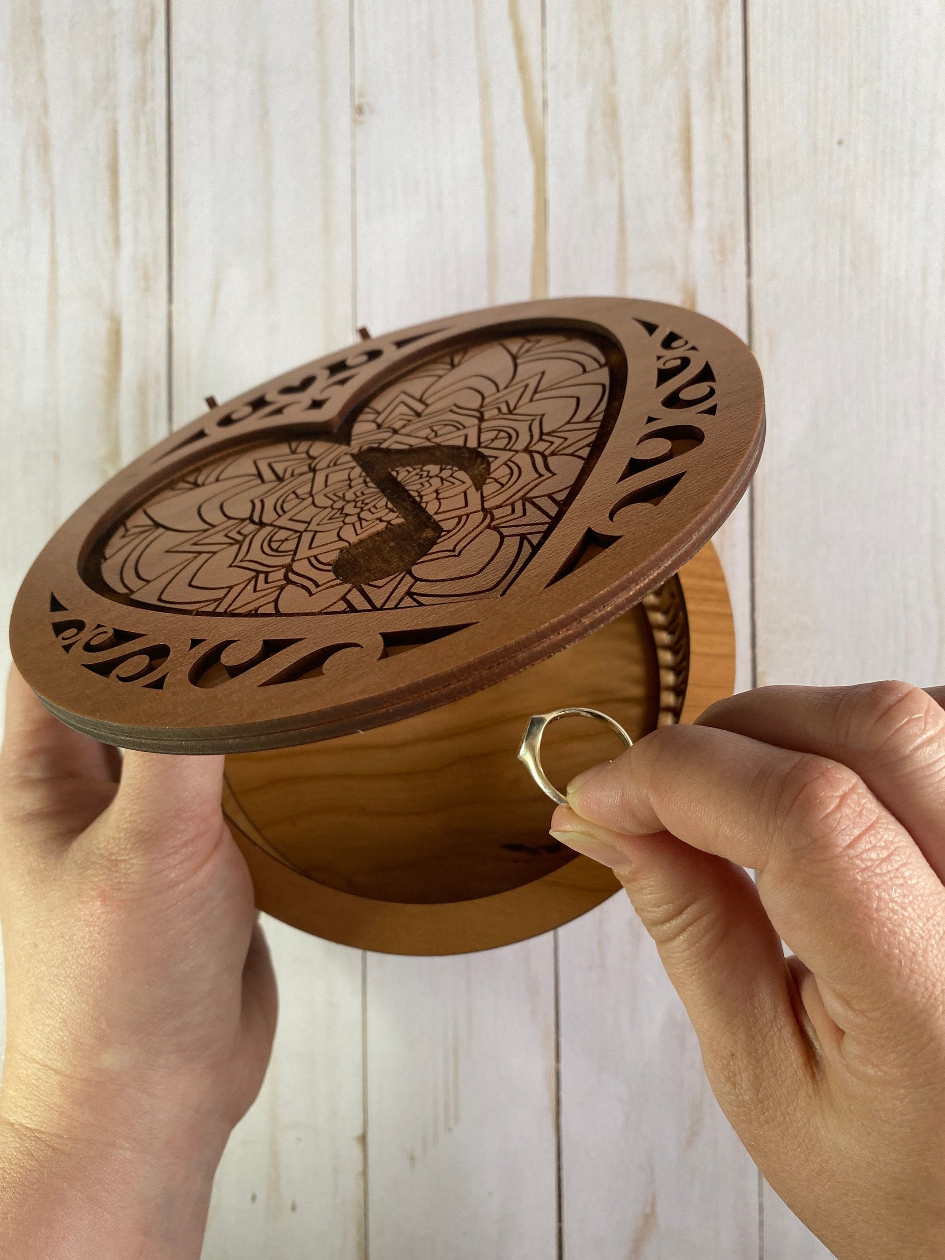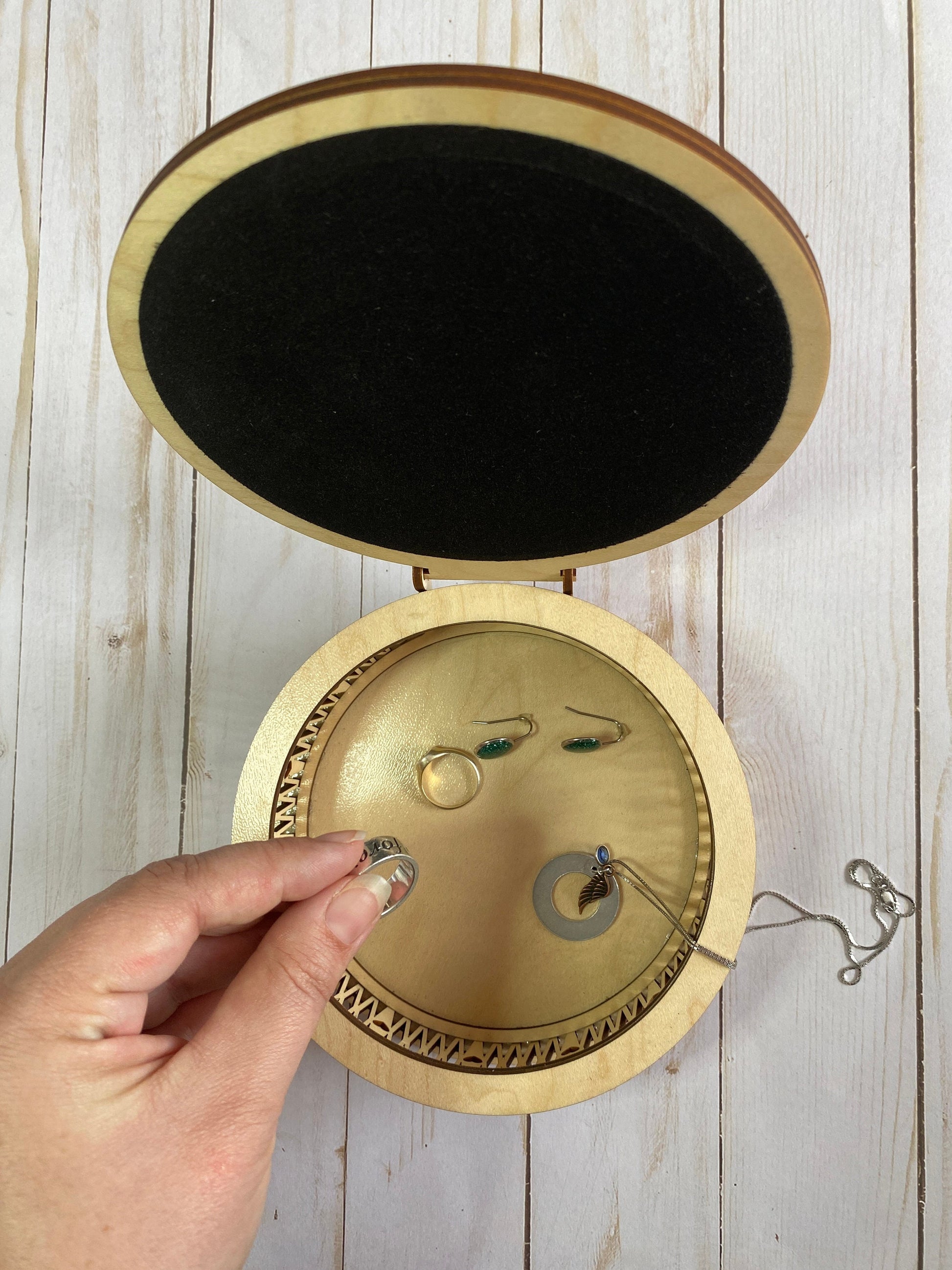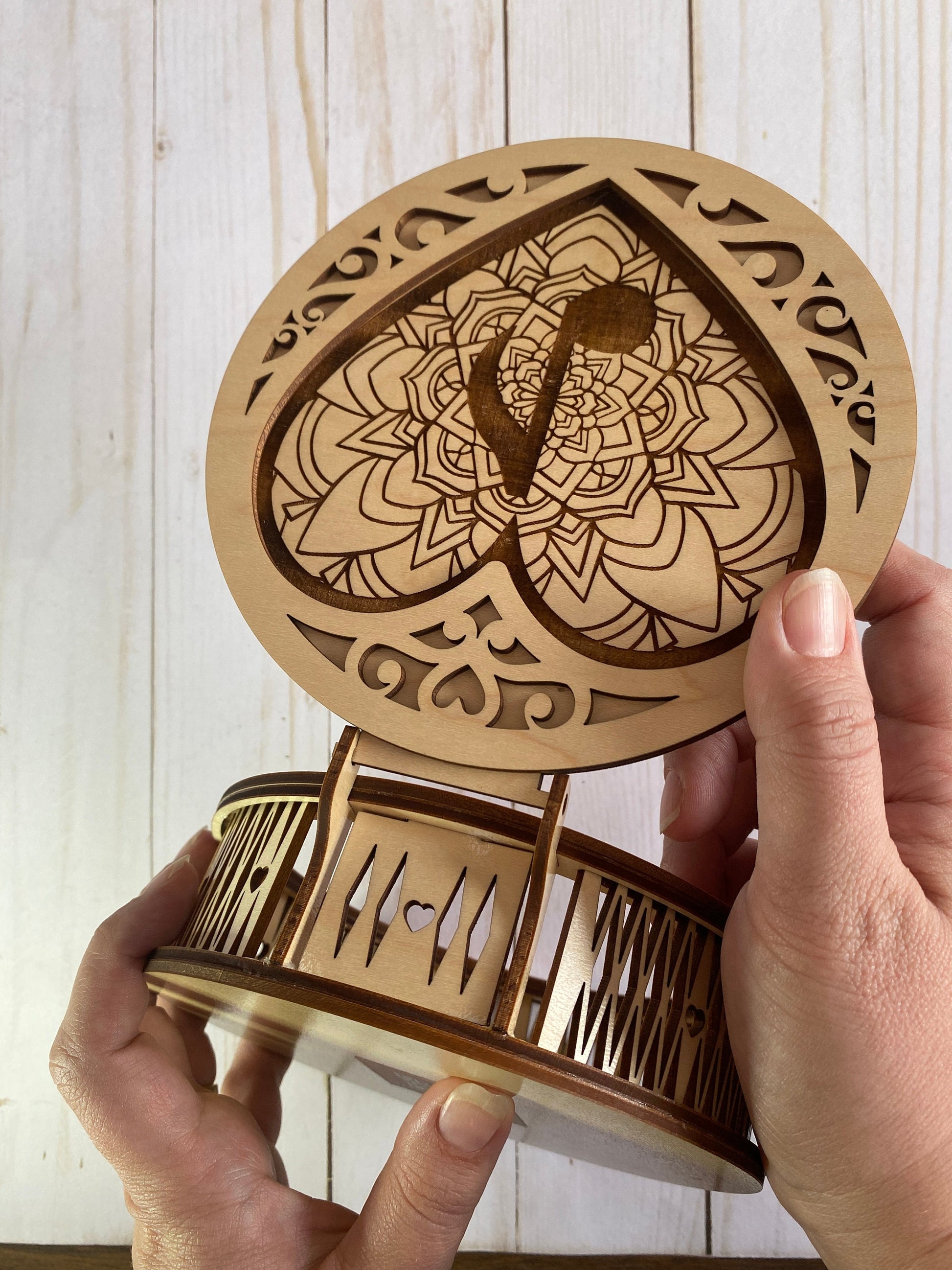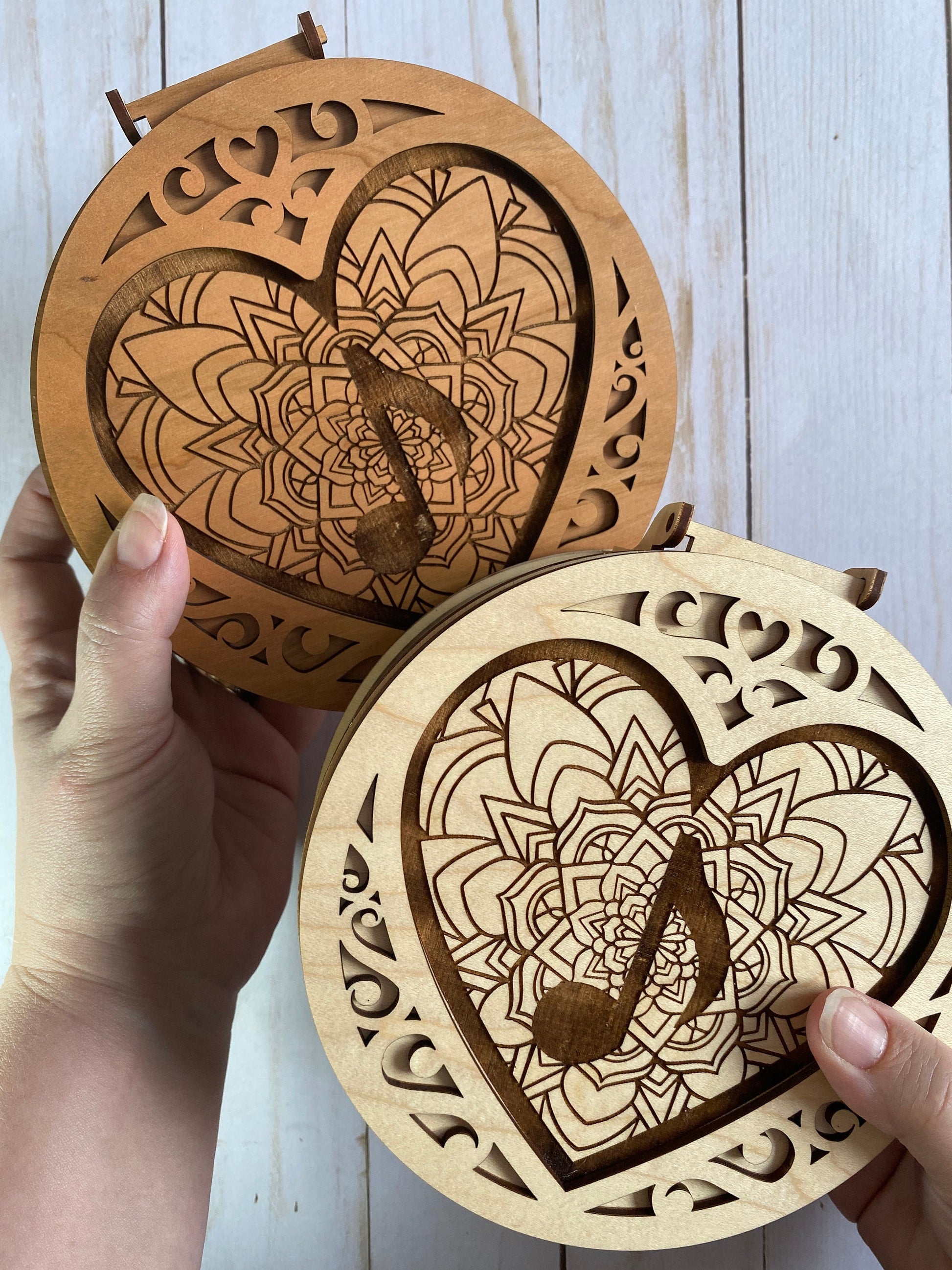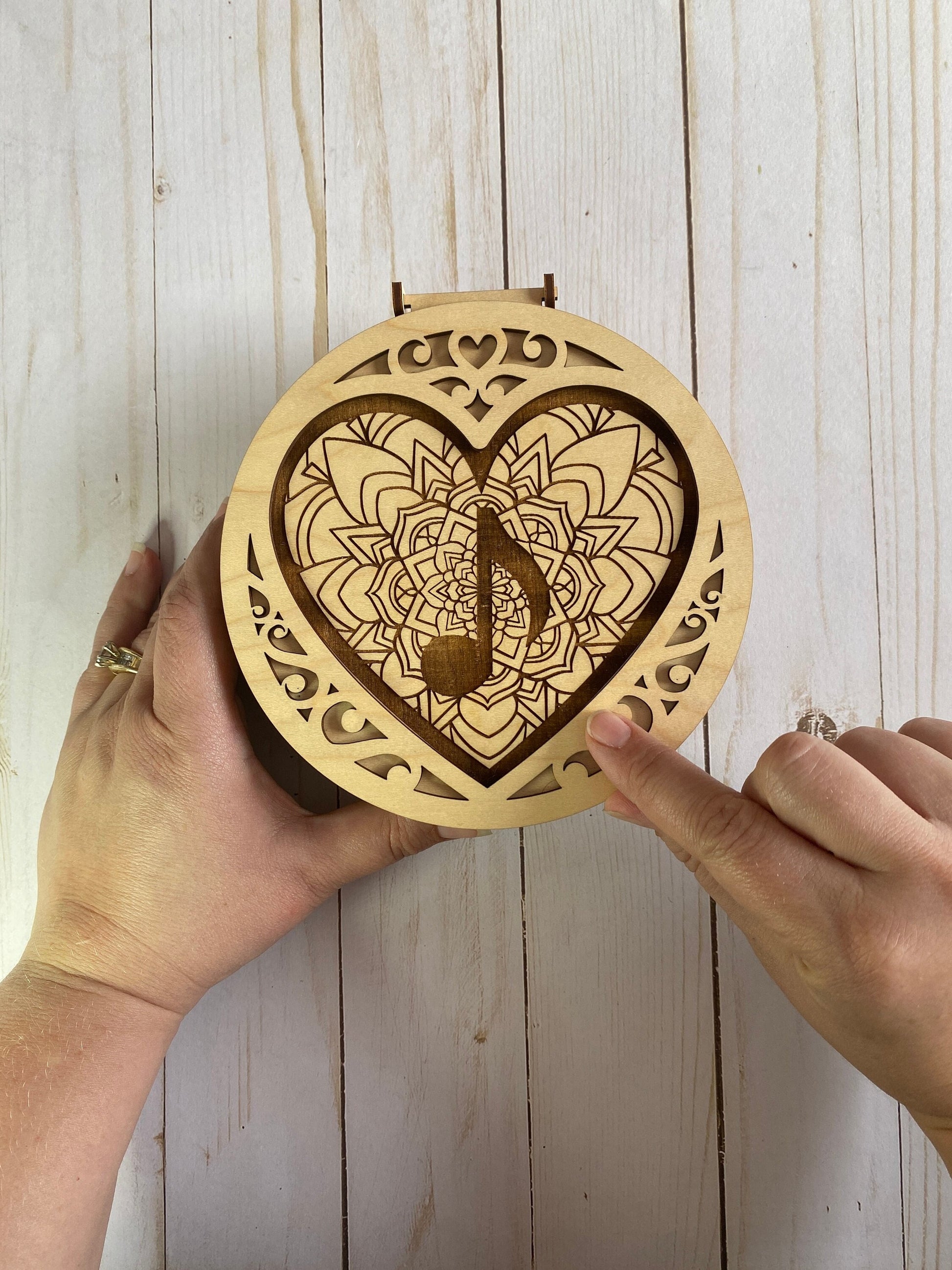 6 inch round wood jewelry box, engraved music note box, gift for musician, laser cut circle box, mandala heart design, living hinge box