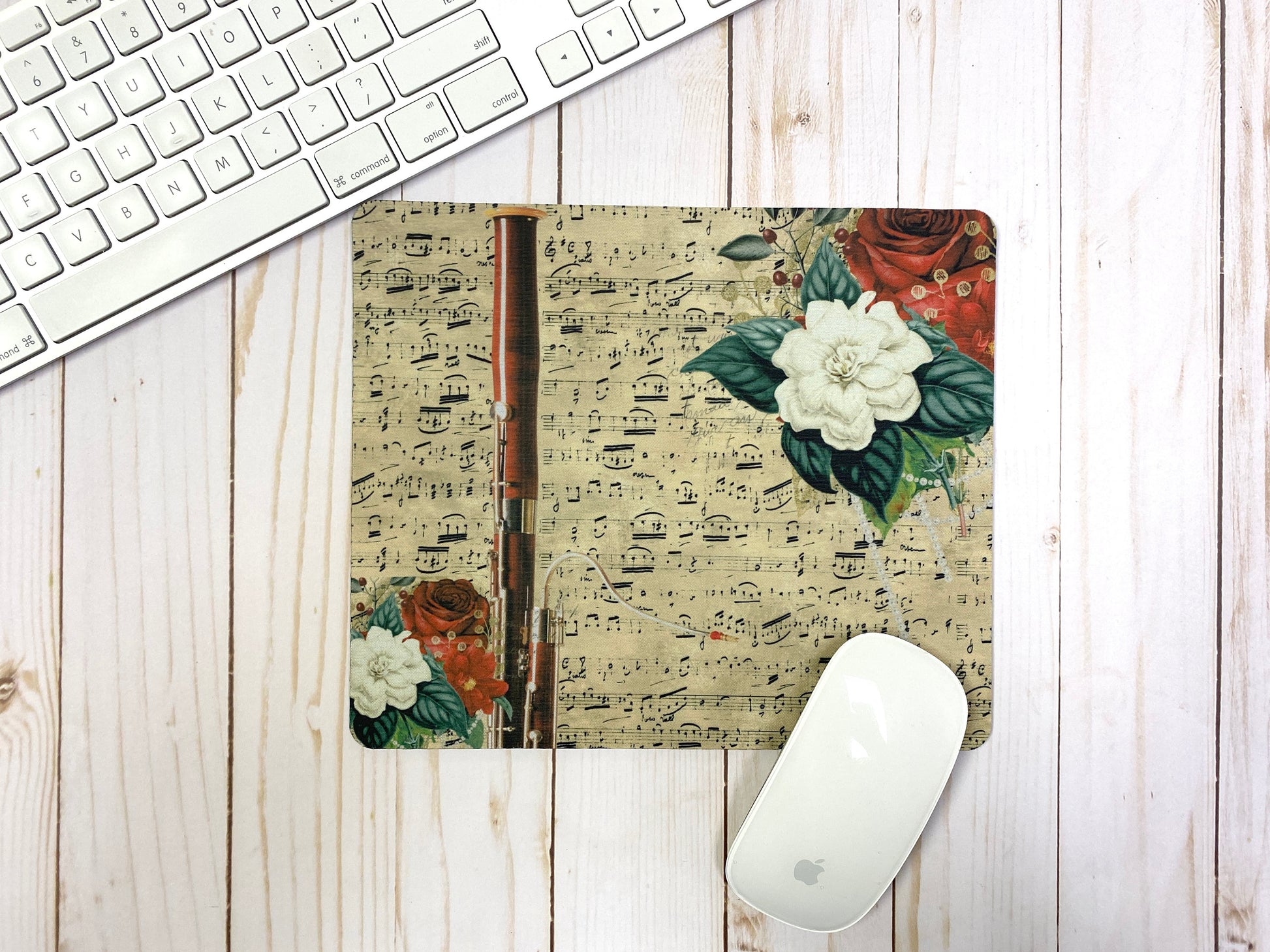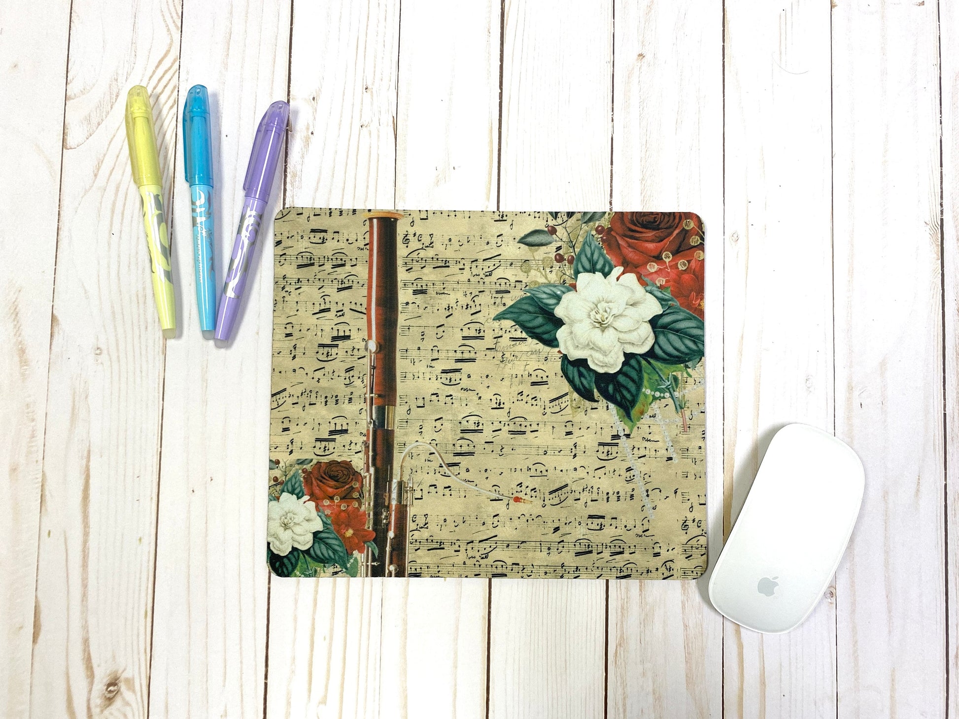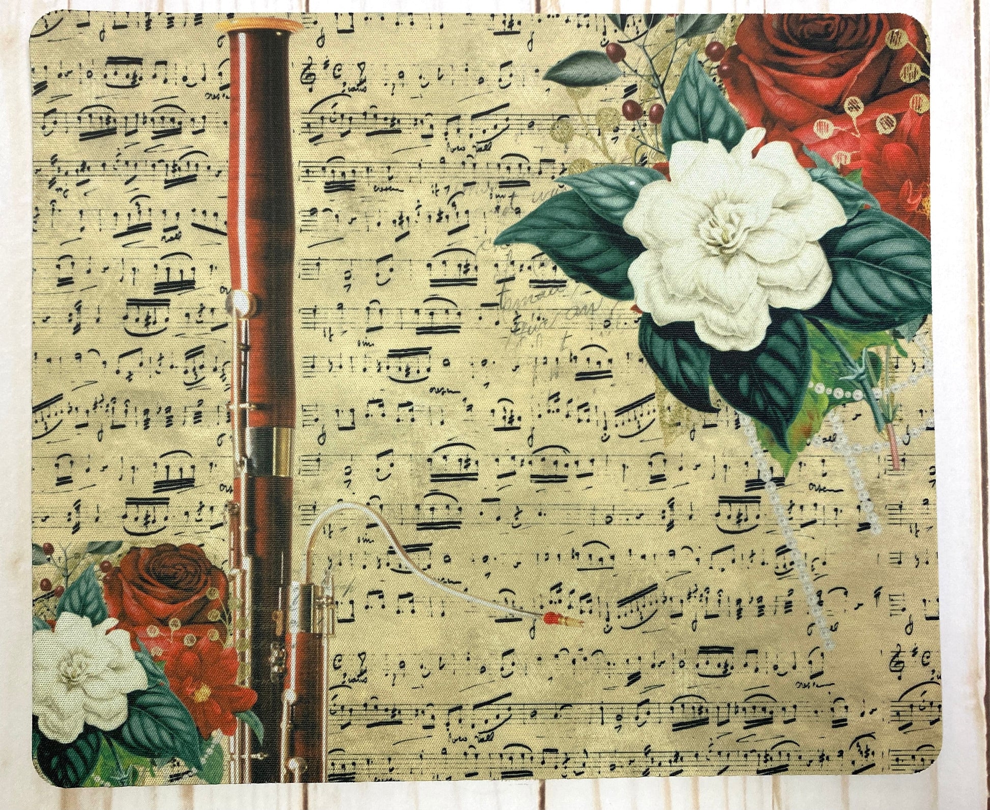 Bassoon mousepad with vintage sheet music and vivid floral design, gift for bassoonist, double reed gift, musician present, back to school