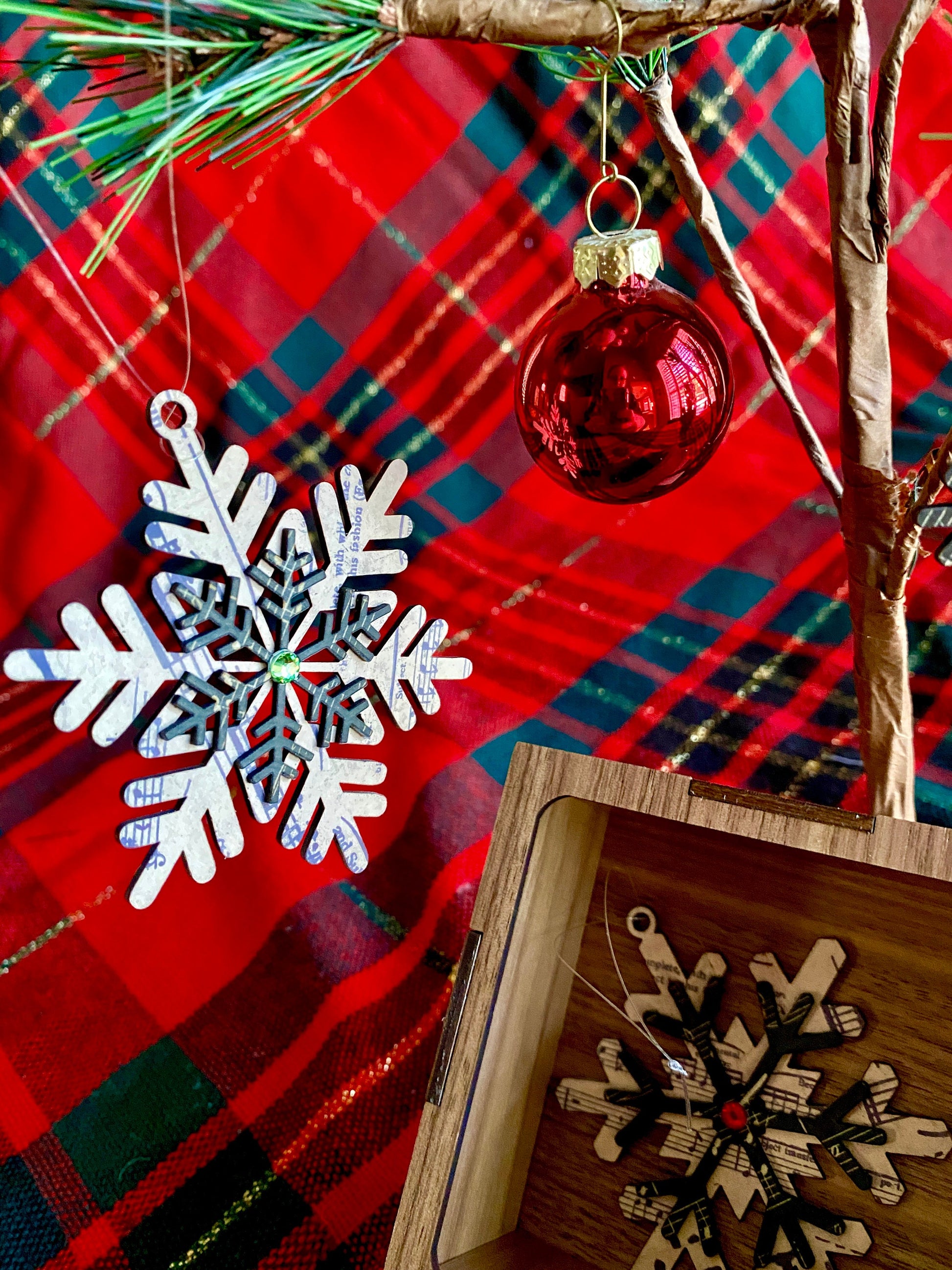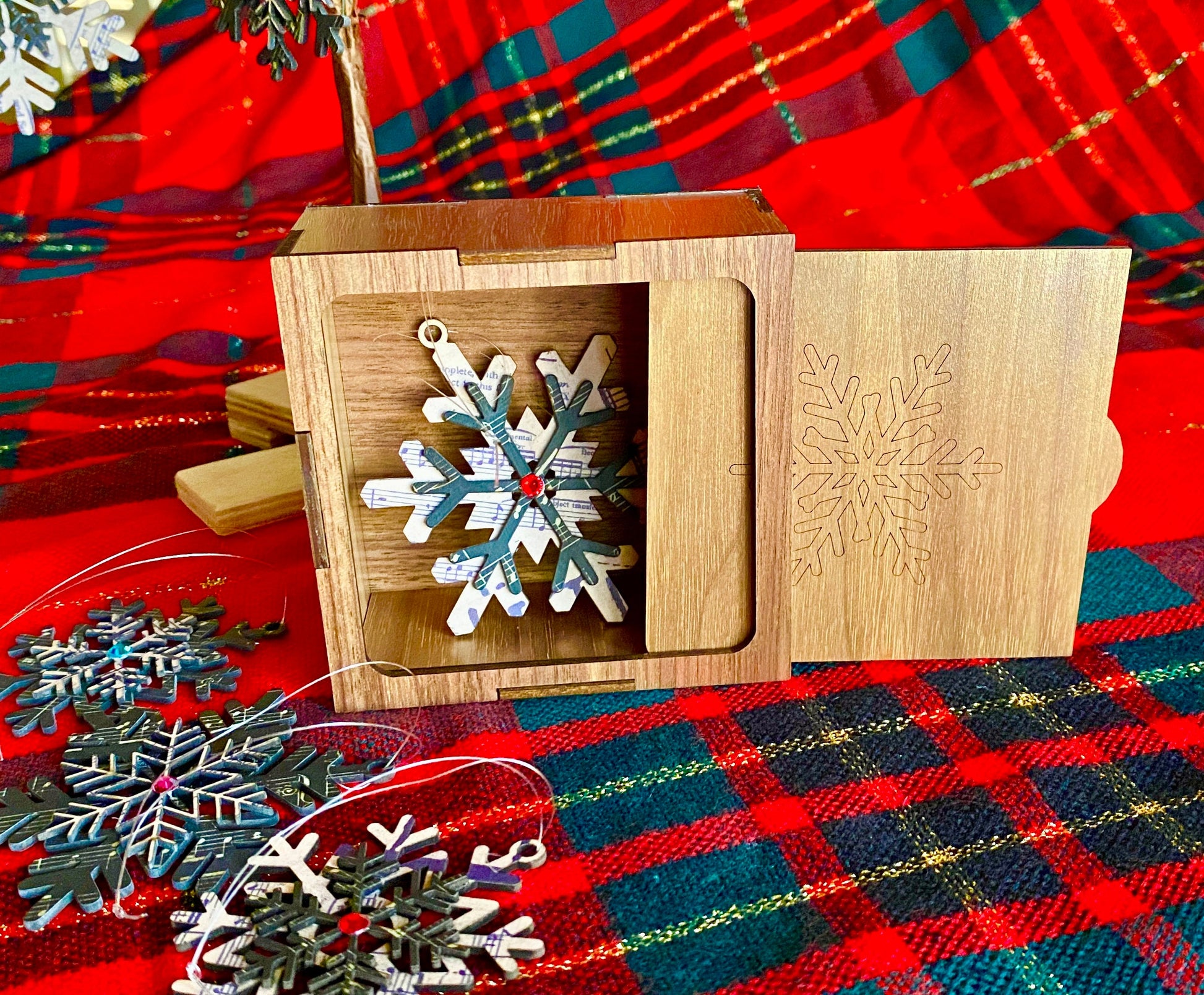 Decoupage Sheet Music Ornament set with Matching Box, Layered Snowflake Ornament Set, Ornament Gift Set, Mini Snowflake Ornaments, Set of 6