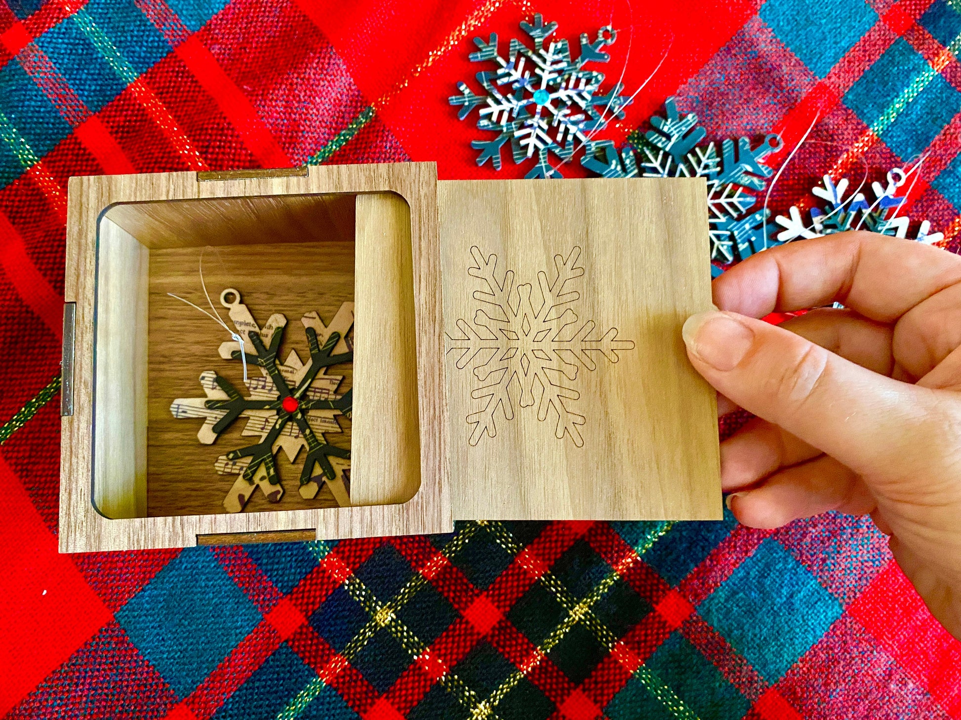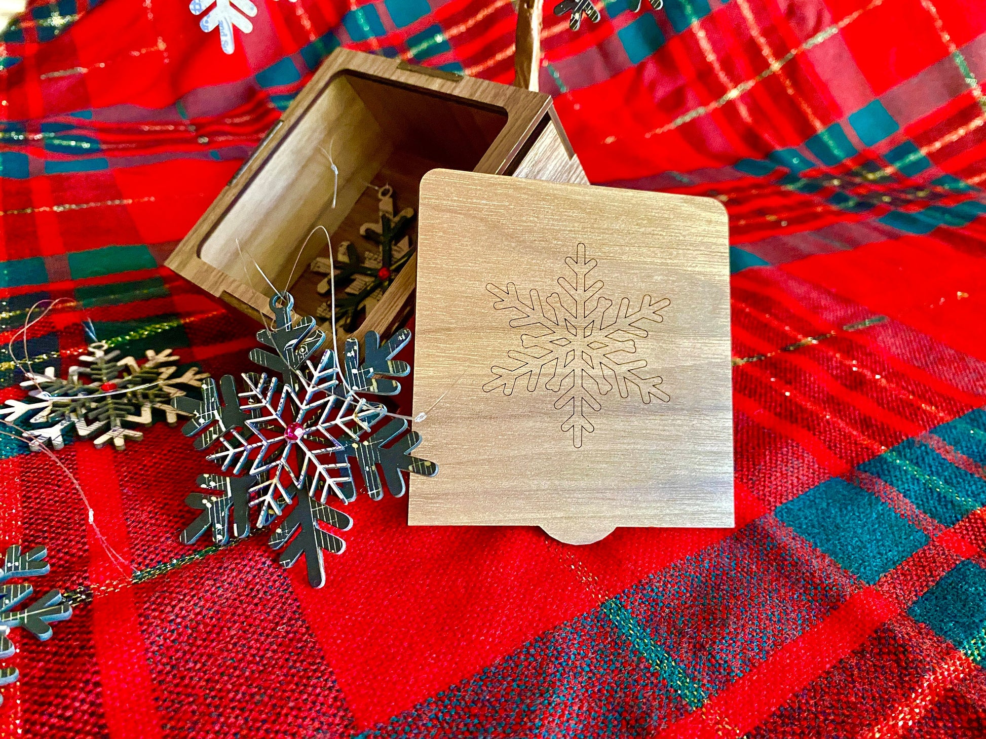 You are getting a set of 6 delicate dual-layered snowflake ornaments with a matching engraved gift box. Snowflakes are hand decoupaged with vintage sheet music designs and accented with assorted colored rhinestones. A set of 6 includes varied snowflake shapes. Each snowflake already comes with an 'invisible' loop for hanging. Snowflakes measure approx 2.5" in diameter. Gift box measures 4" x 4" x 2"