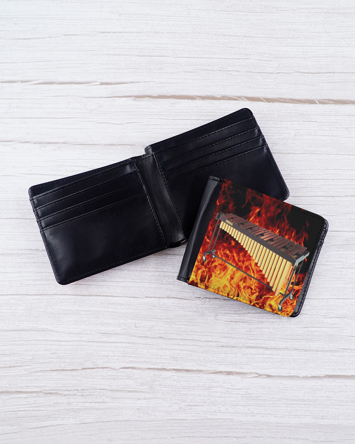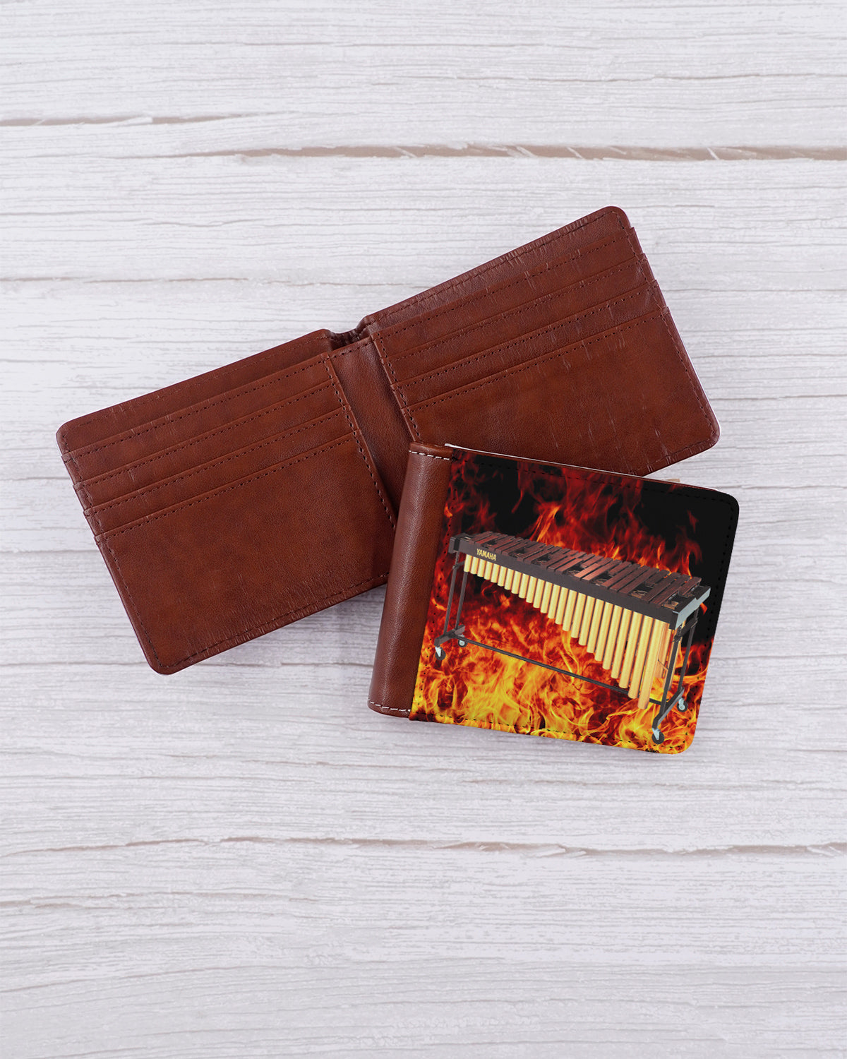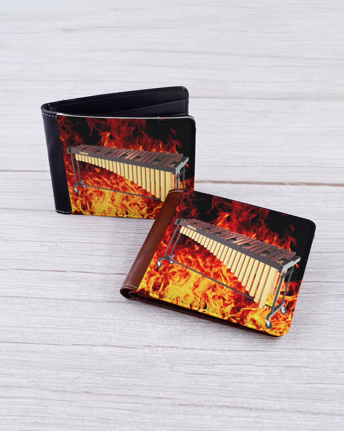 This Flamin' Sousaphone Wallet features a cool, youthful design with a fiery background and a warm rosewood marimba image. Featuring a men's-style billfold and unique look, this wallet is a must-have for any music-loving mallet player. (Plus, it's a great conversation starter.) Choose brown or black leatherette.