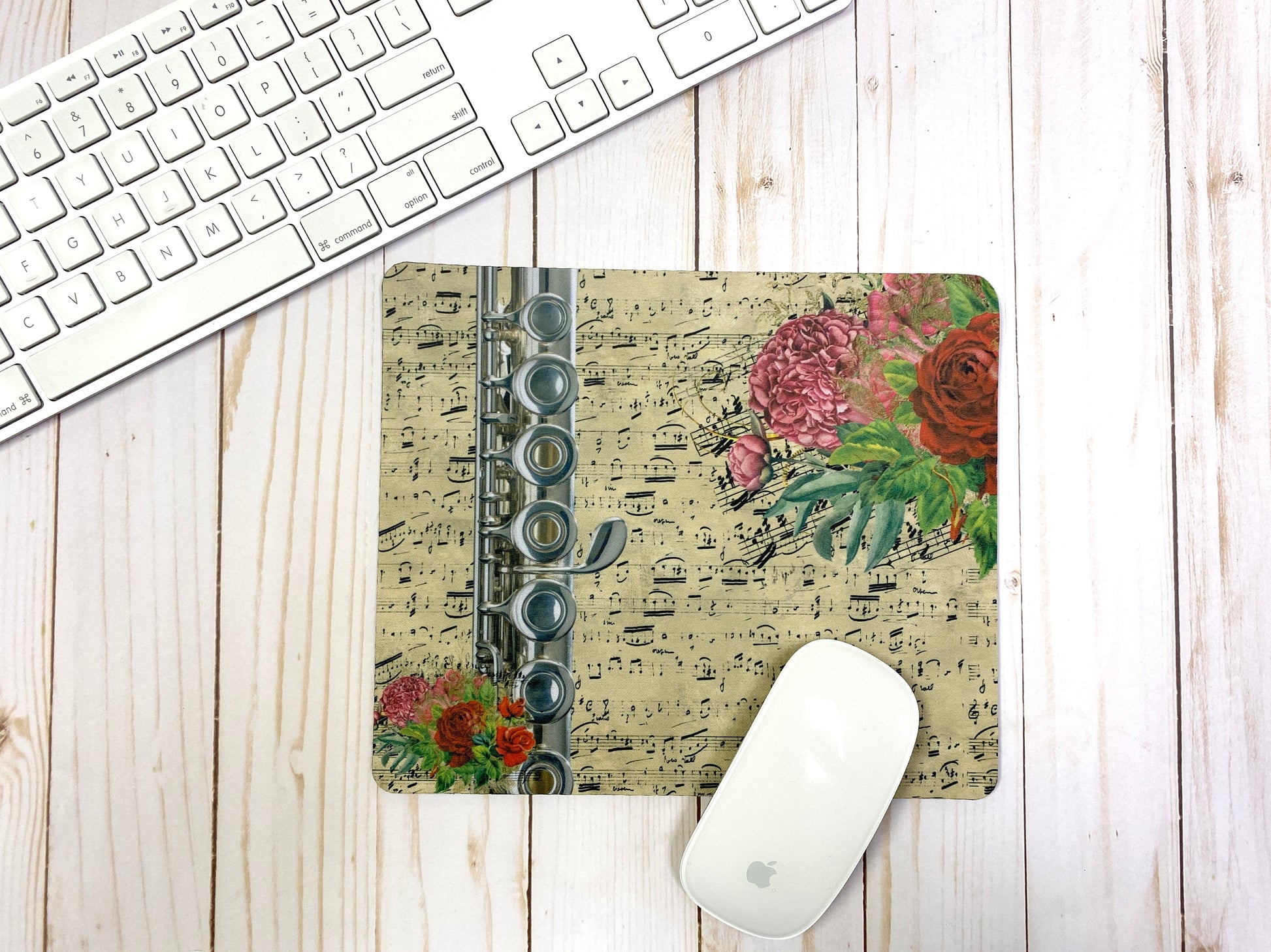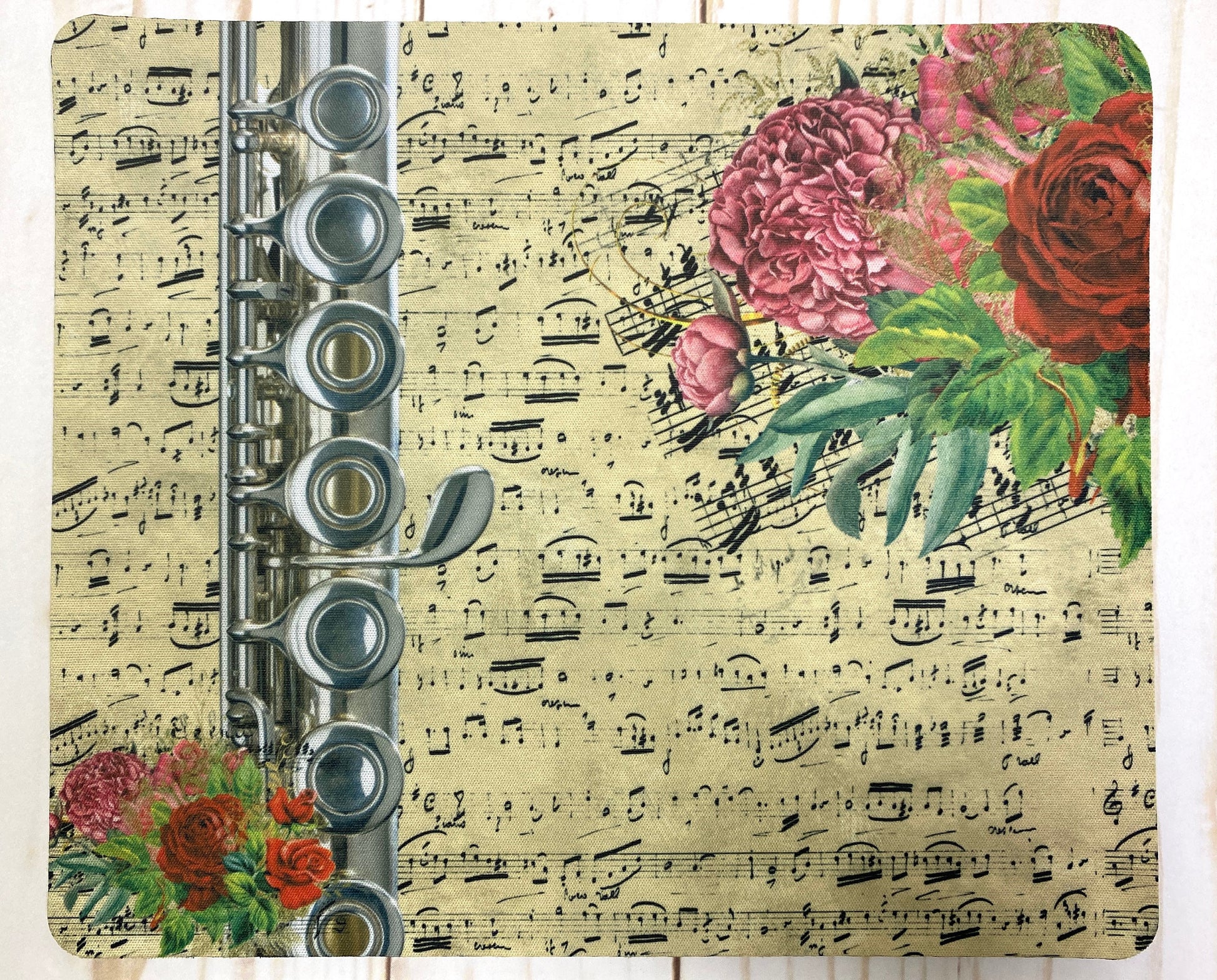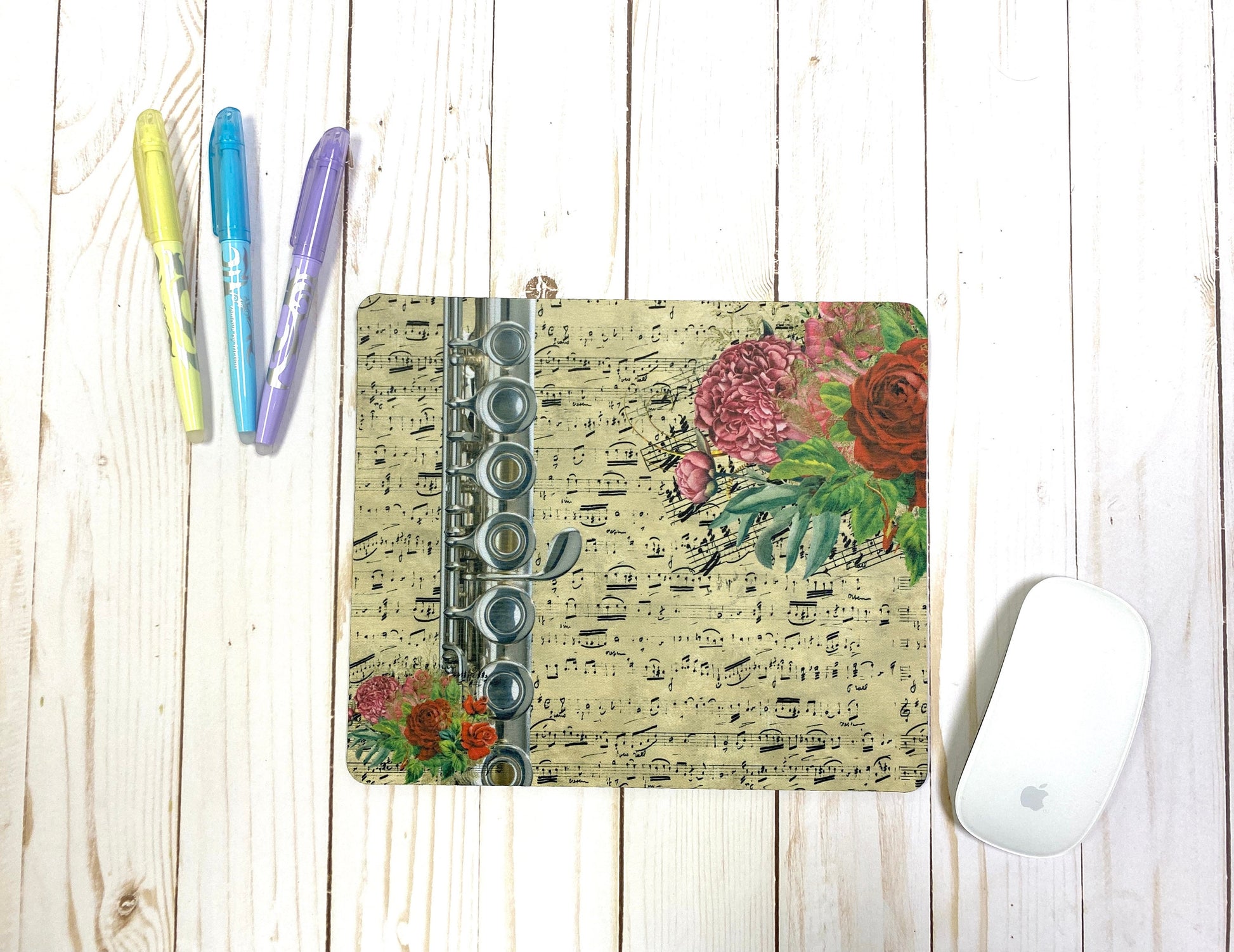 Flute mousepad w/ vintage sheet music & vivid florals, gift for flautist, flute player gift, back to school, college Student teacher gift