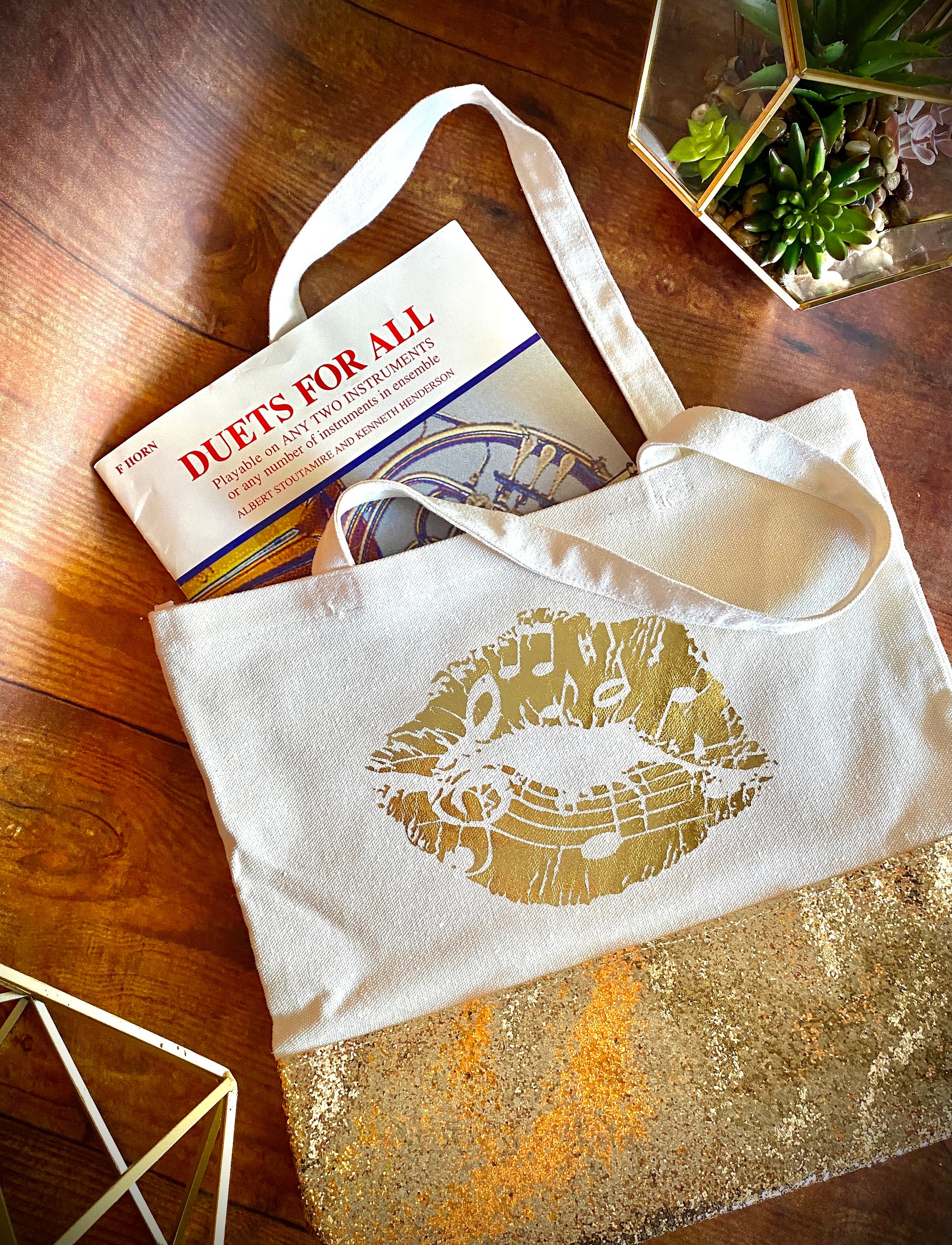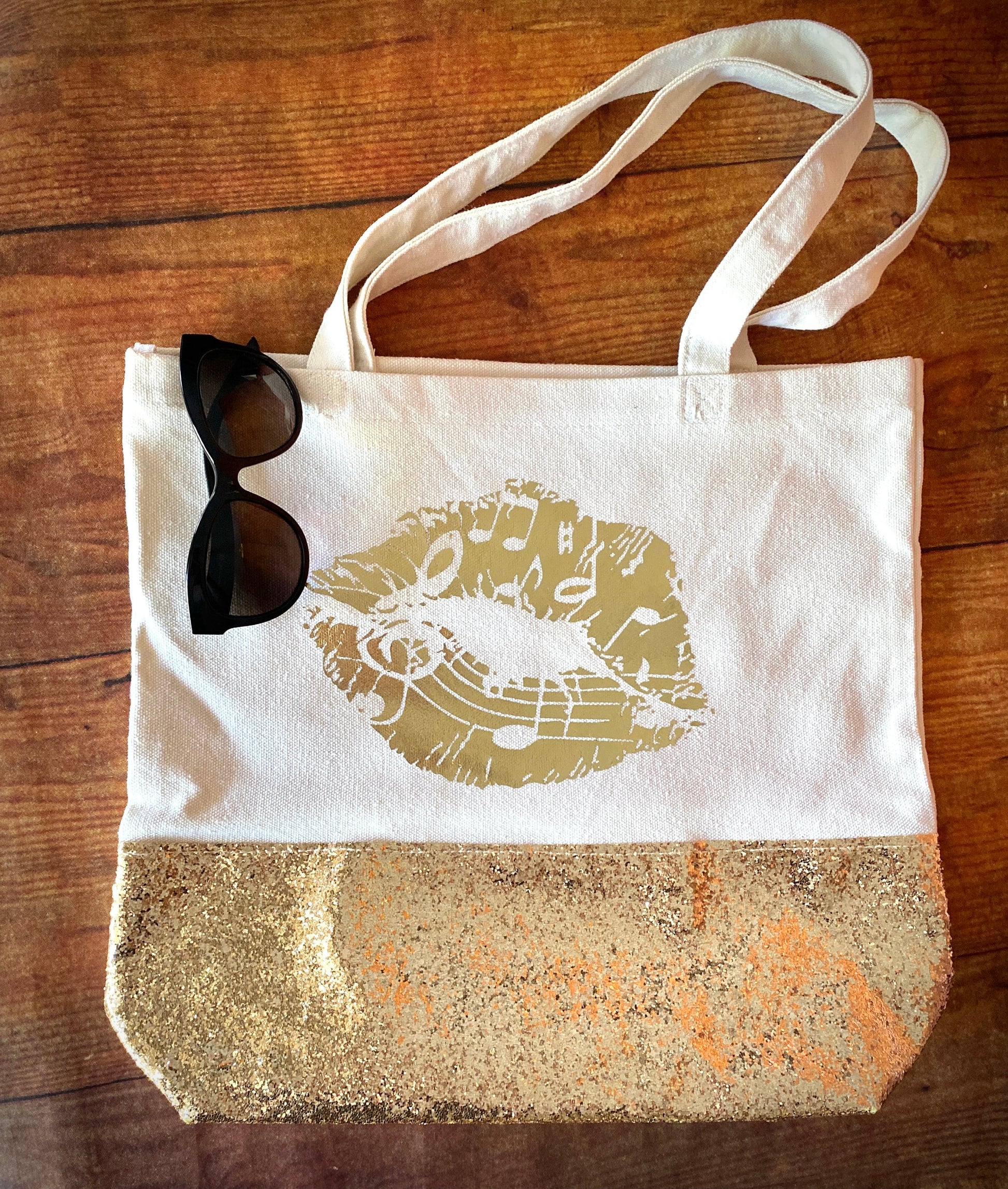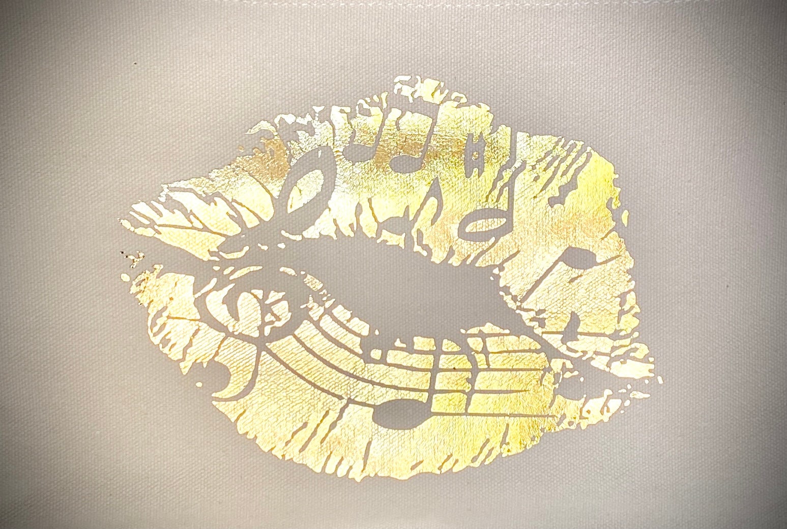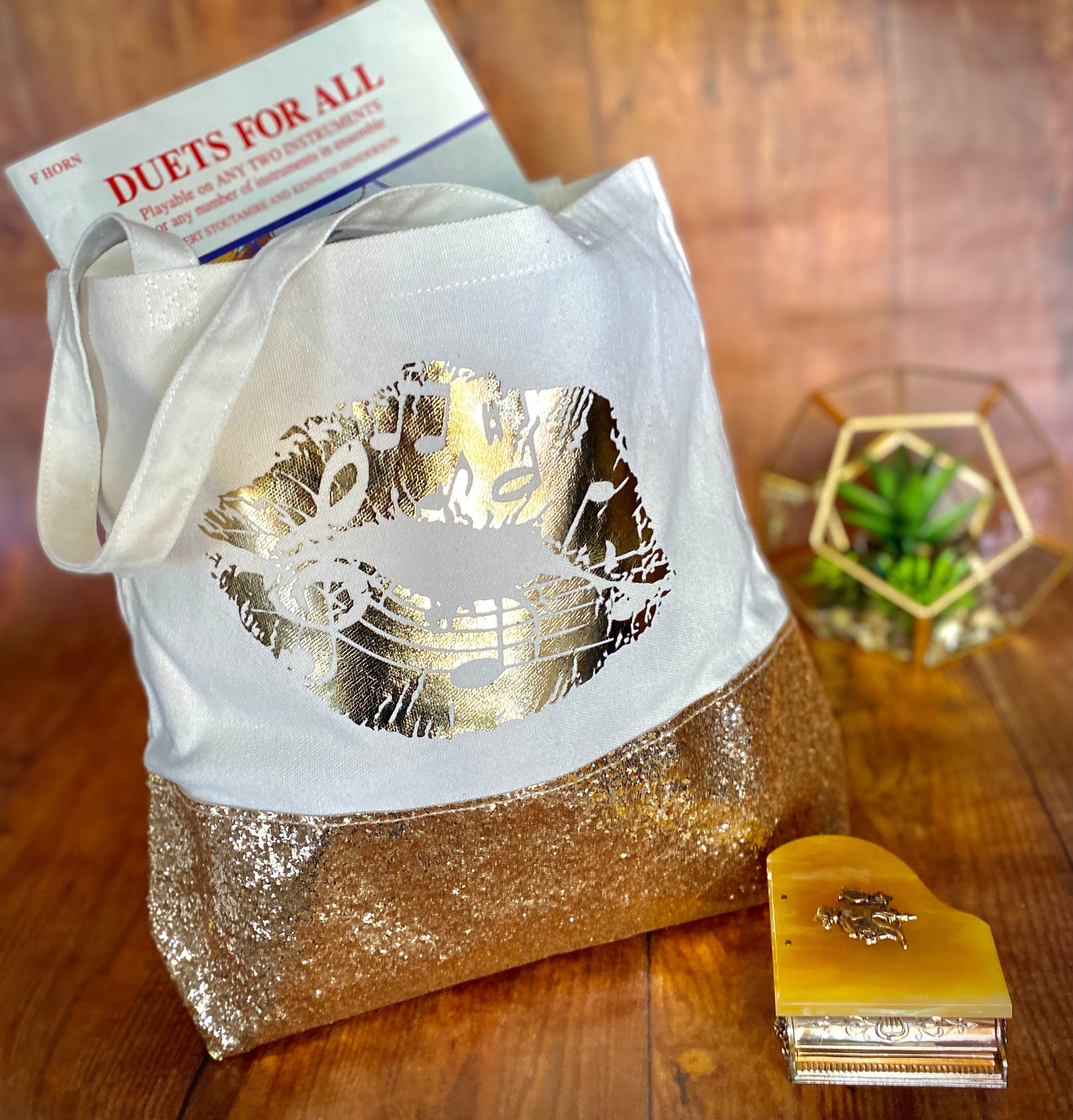 This lightweight canvas tote bag can fit all your items for a fun day out or hauling your sheet music to private lessons. The metallic gold music lips graphic really grabs your eye and compliments the gold glitter on the base of the bag.