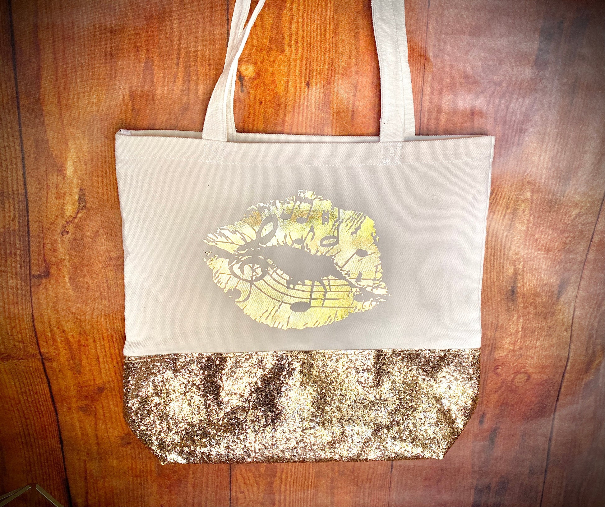 Gold Music Lips Canvas Glitter Tote, Music Lover Glitter Purse, Sparkle Sheet Music Bag, Back to school college music student teacher gift