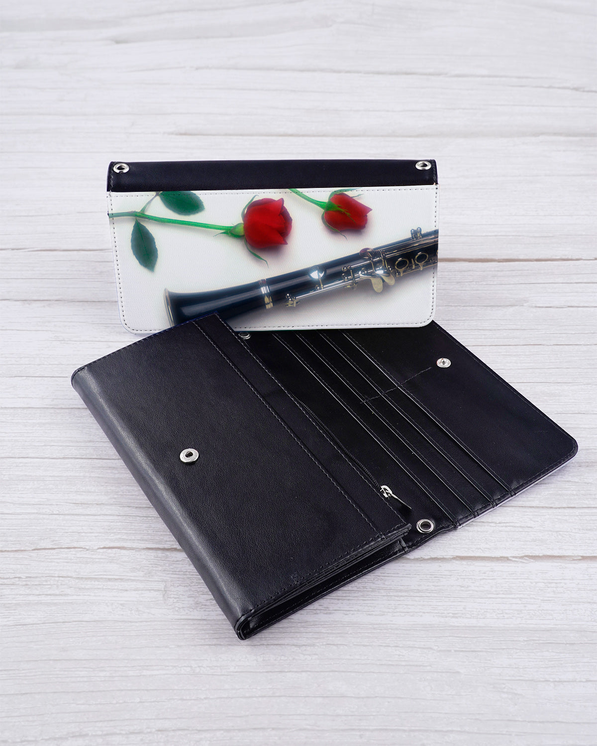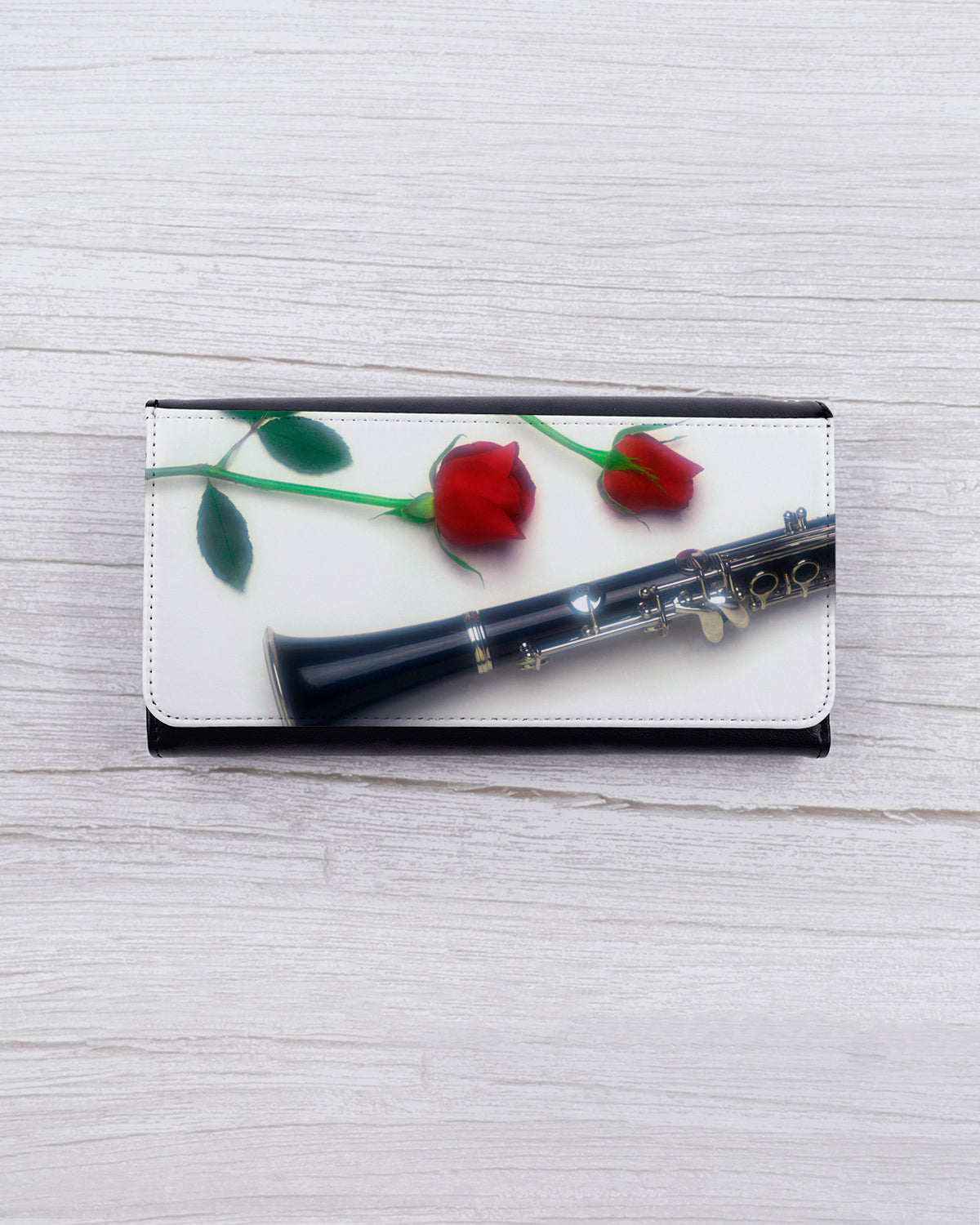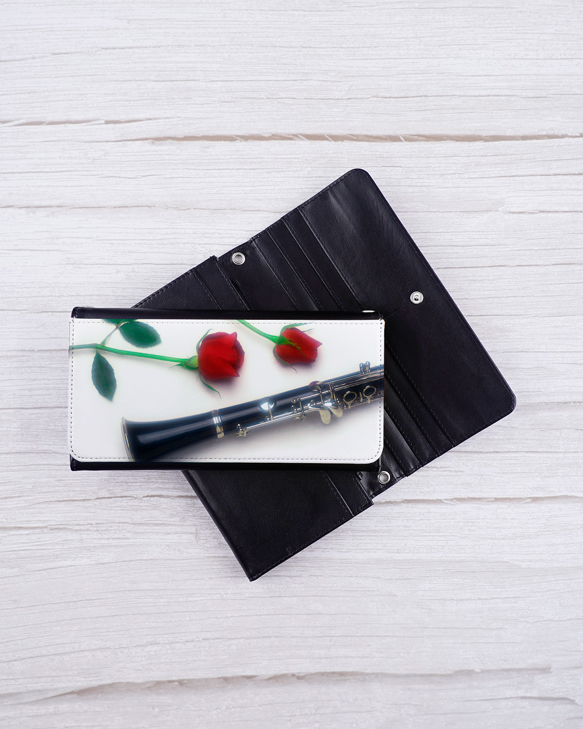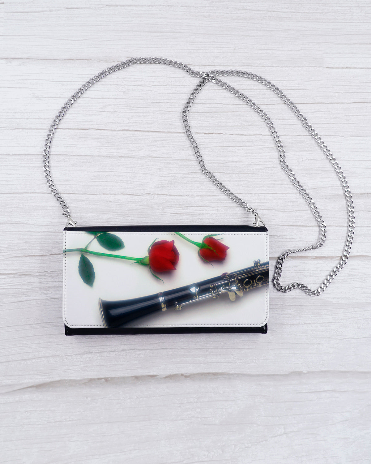 Add some flair to your ensemble with our Romantic Clarinet Wearable Wallet. Versatile crossbody chain or wristlet wear allows for hands-free convenience. Adorned with red roses and an ebony clarinet image, this sleek and classic design will show off your love for music while keeping your valuables secure.