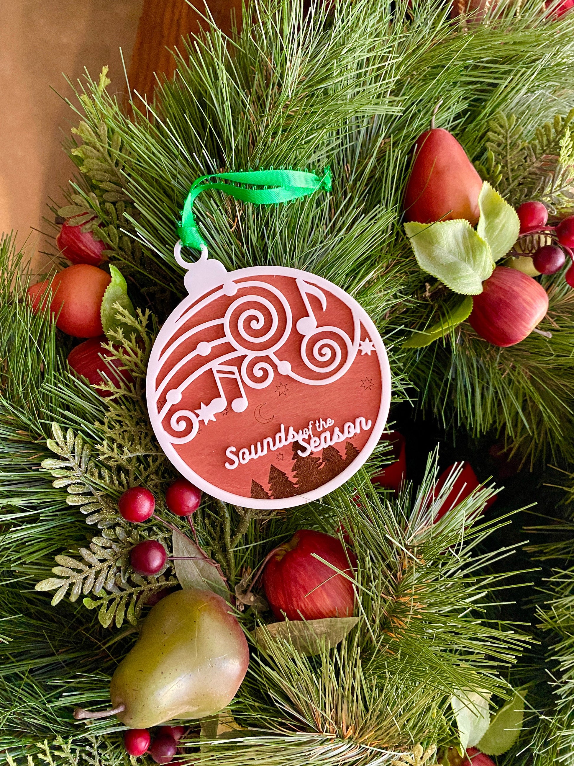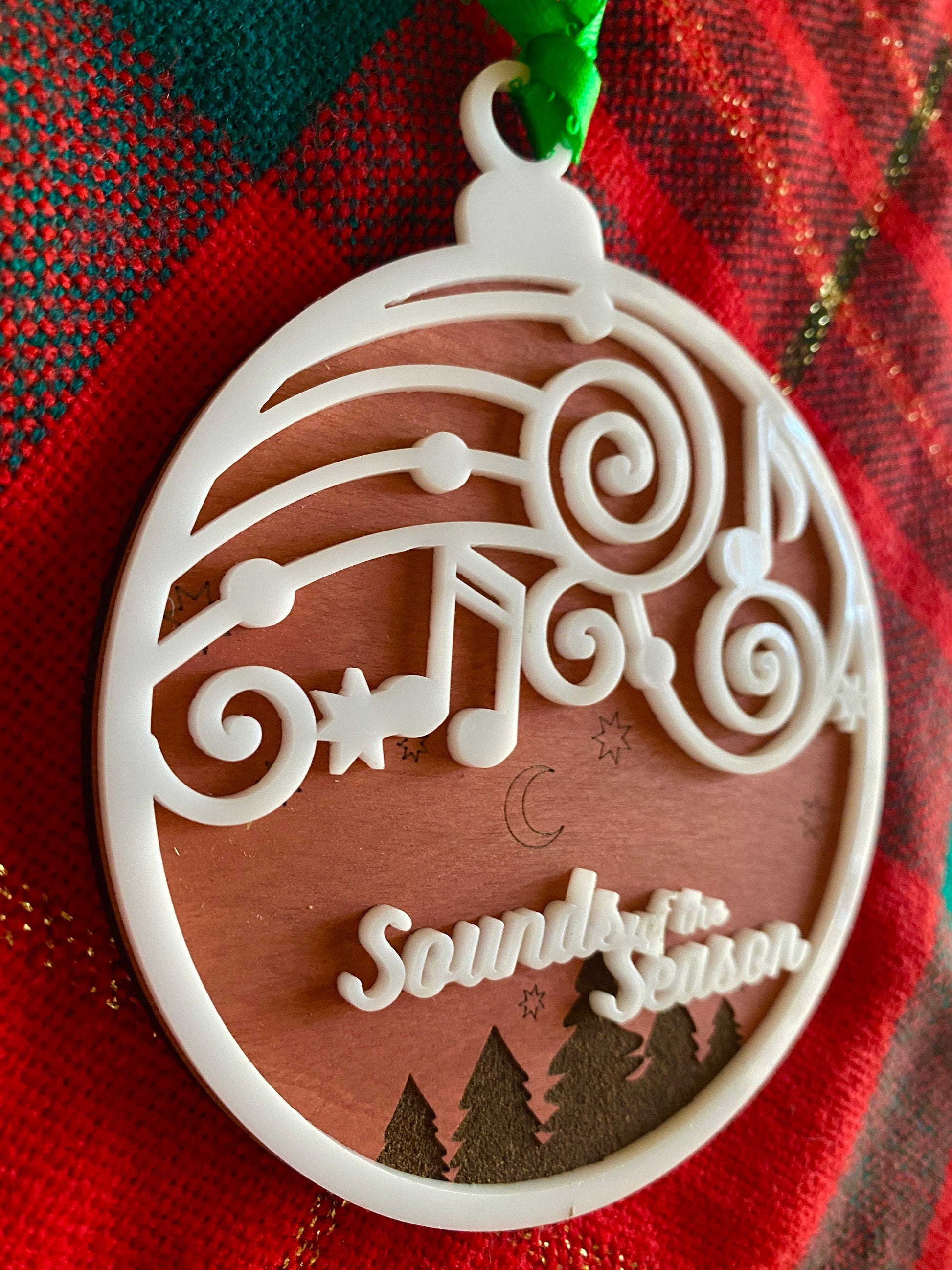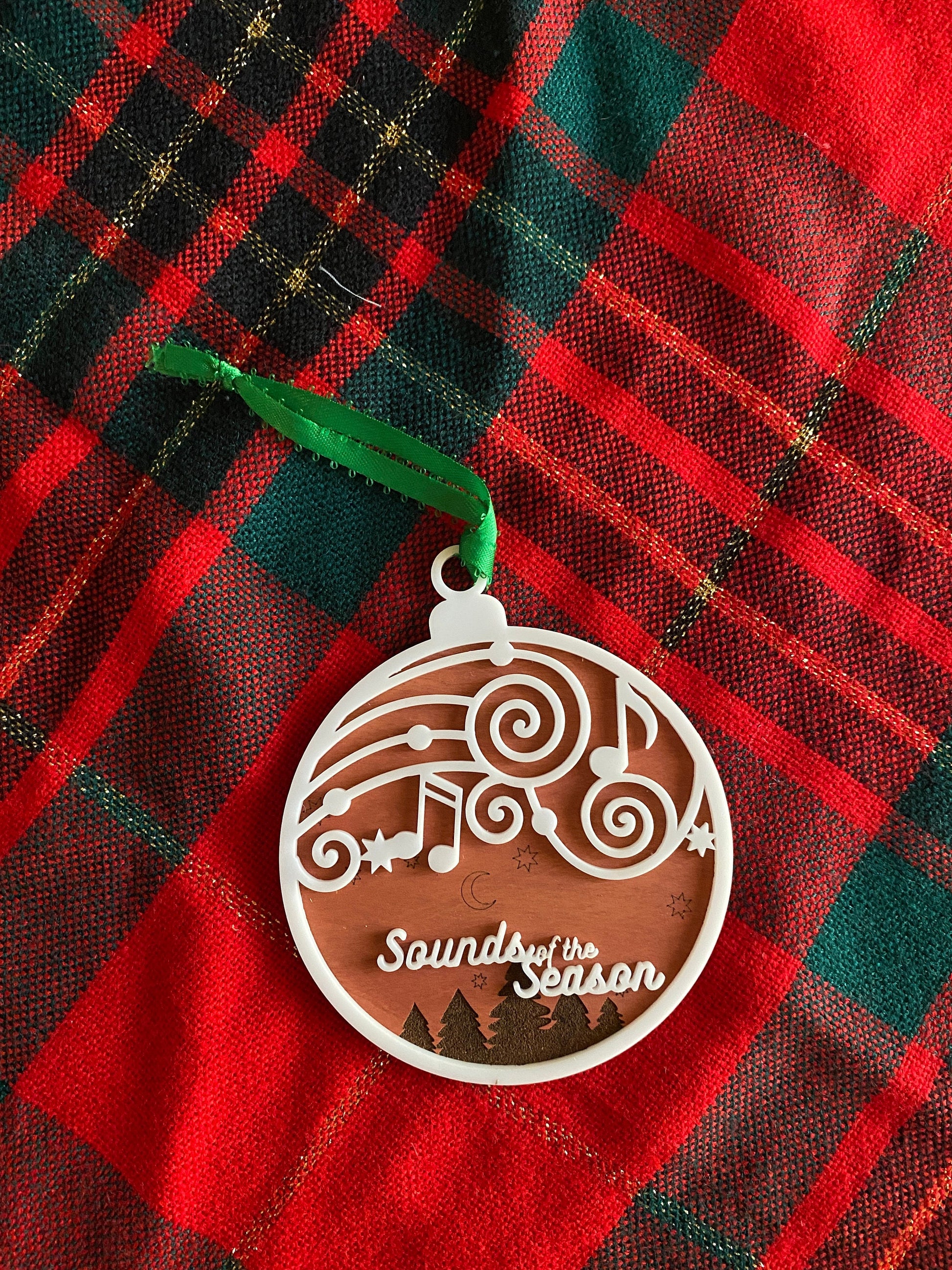 Sounds of the Season Wood Ornament, Layered Acrylic Ornament, Engraved Wood, Music note ornament, Handmade Christmas gift, Music lover gift