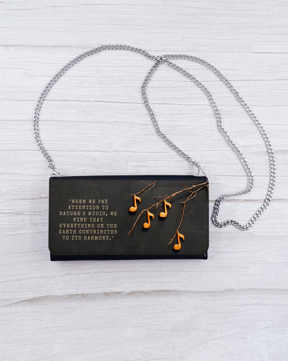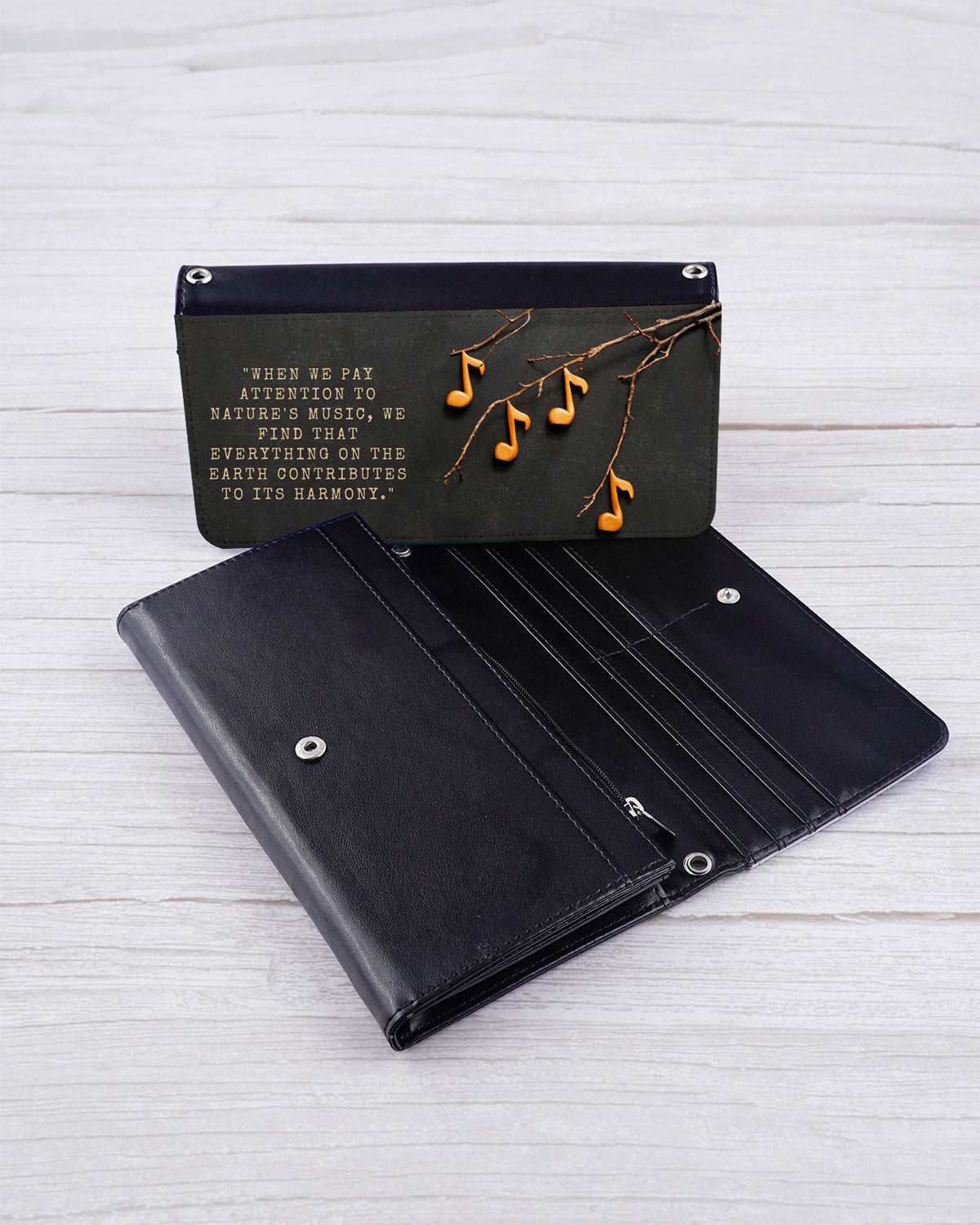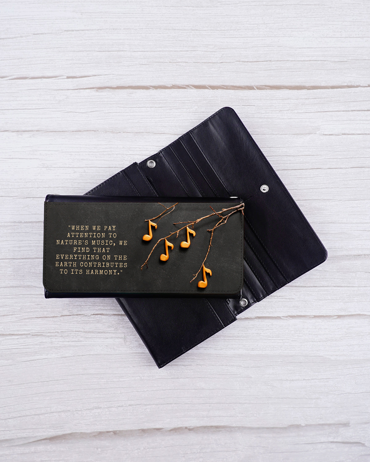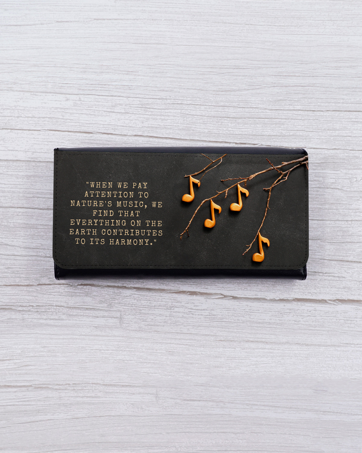 Groove to nature's beat with our Nature's Music Wearable Wallet. Combining function and style, this versatile money folio is perfect for music lovers. Featuring a natural earthy design and an inspirational quote, staying organized has never been so melodic!